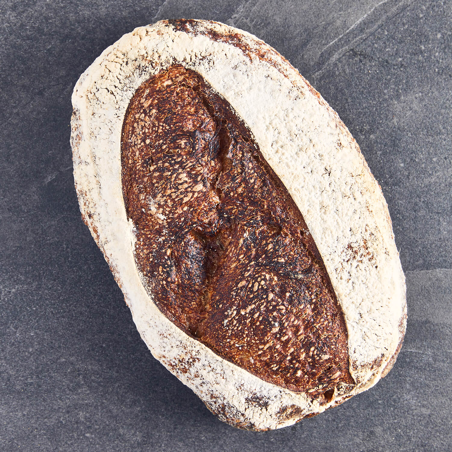 Due to the retarded method, where we refrigerate the bread dough for 18 hours prior to baking, the natural yeast and bacteria in the sourdough culture continue to slowly ferment the dough over a longer time. This extended fermentation allows the dough to develop more complex flavors, aromas and a more pronounced sourdough tang. Its high hydration gives the bread its wonderful open texture and its flaky crust.